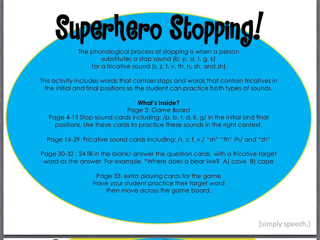 To work on correcting this phonological process, I created Superhero Stopping! This is a 33 page activity that targets both stops and fricatives. I chose to include both sets of sounds so that the student can practice the stops in the right context.