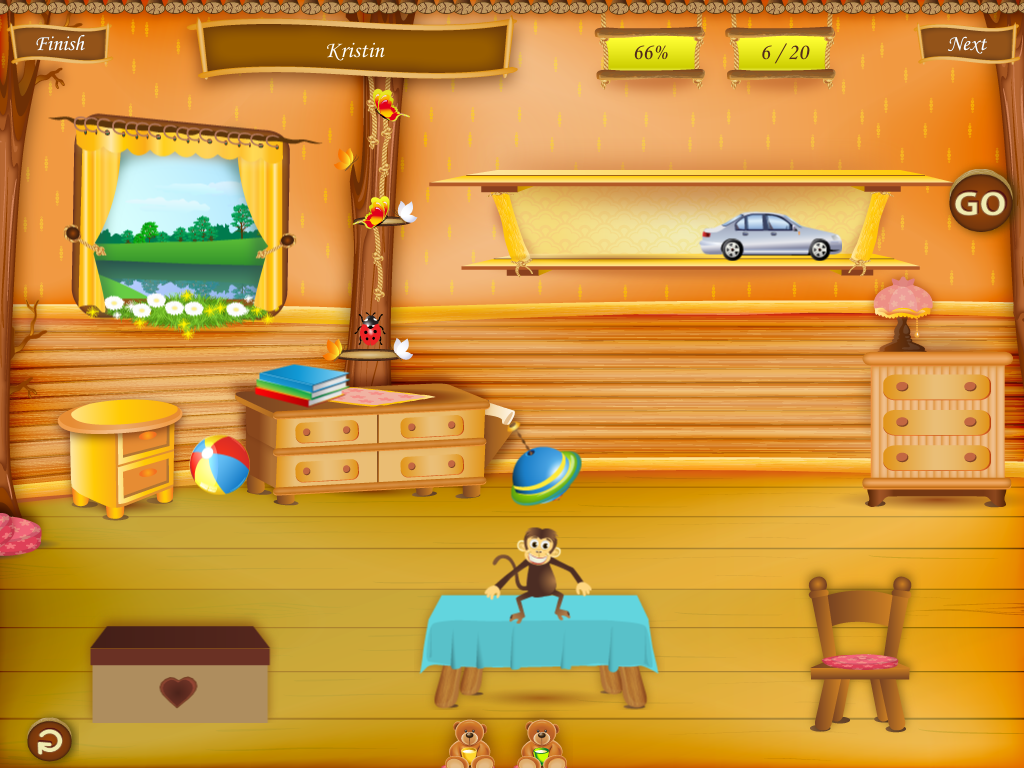 The kitchen is where we work on rhyming, identifying initial sounds, and identifying final sounds. Here, your student is prompted with a question such as, "Where can I find something that rhymes with heat?" or "Do you see something that starts with an /s/ sound?" depending on your target settings.